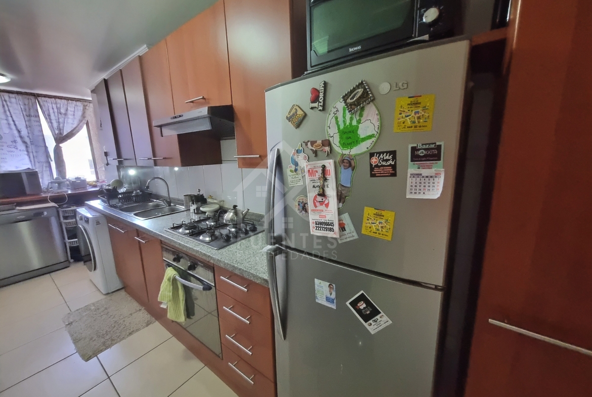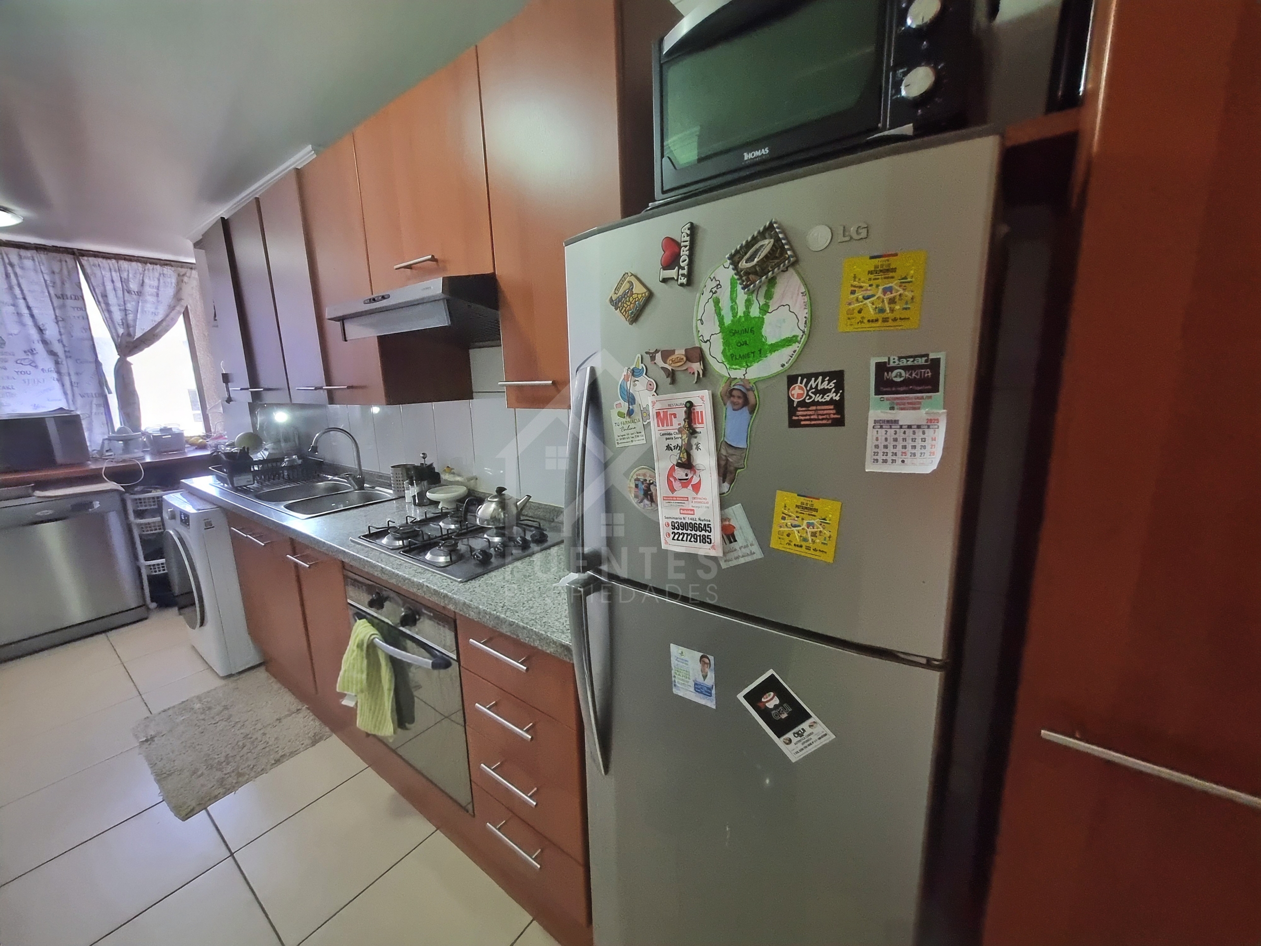 Hall de entrada, amplio living comedor con salida a terraza, 3 dormitorios, 2 baños , dormitorio principal en suite con terraza propia y vista amplia, closet espacioso, baño principal completo con ventana propia, 2 dormitorios con closets, baño de visita completo. Cocina independiente con logia, full amoblada y equipada con encimera, horno y campana y mesón de apoyo lateral. y mesón desayunador. Despensa en entrada. Calefacción eléctrica cobro individual por depto.